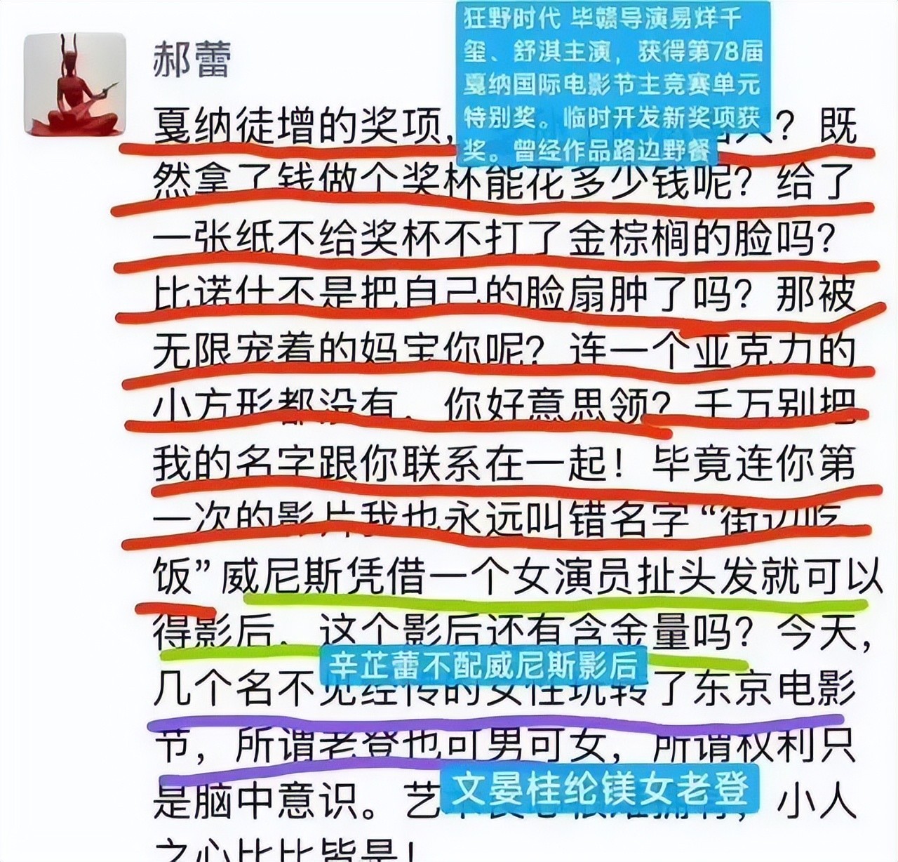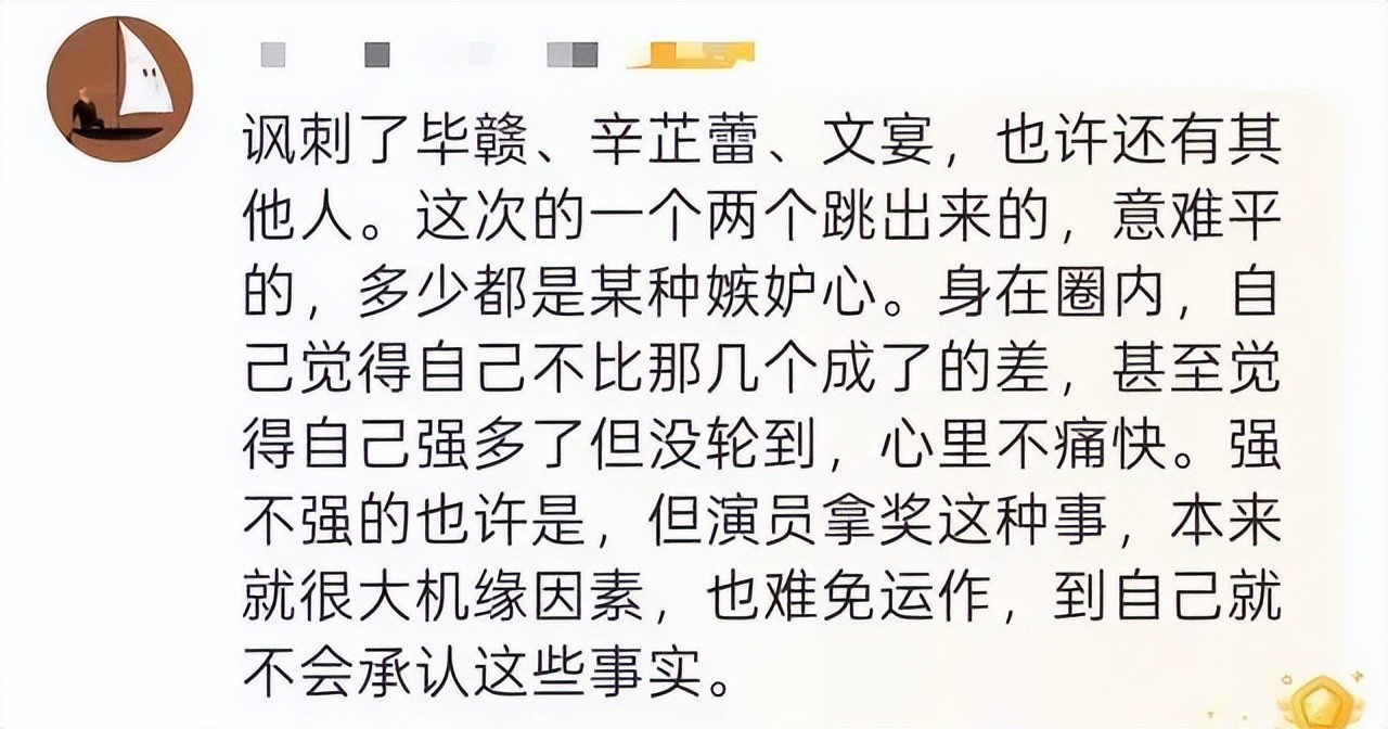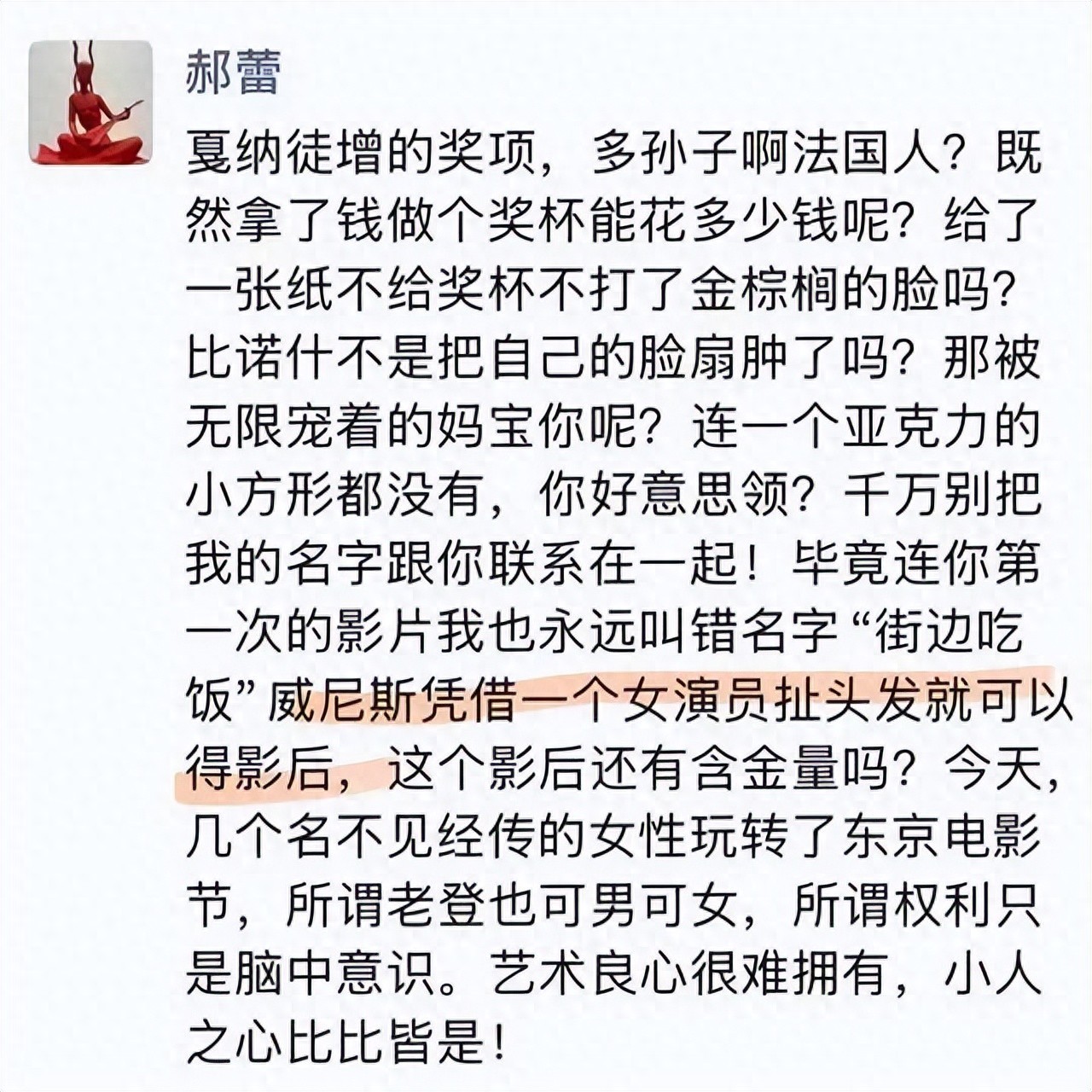 且不说这条朋友圈的真实性,作为一个路人会觉得这条朋友圈针对的更多的是国外电影节的公平公正性,《日掛中天》今天才上映,郝蕾可能都还没看,她跟辛芷蕾也没什么过节,不可能阴阳她。