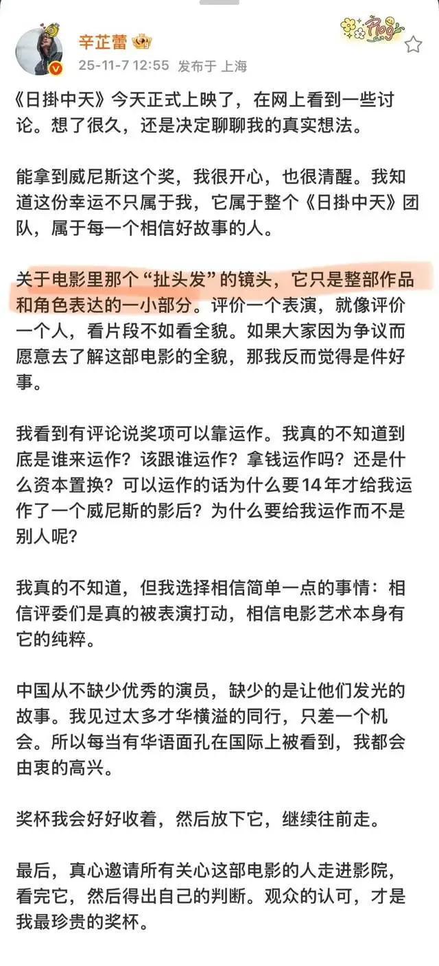 很显然这个前不久辛芷蕾才凭《日挂中天》获威尼斯影后,她这么说不就是指她不配威尼斯影后吗。