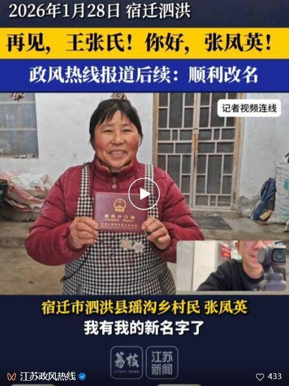 故事要从30多年前说起。那时村里统一代办户口,工作人员大笔一挥,就把“张凤英”写成了“王张氏”。在那个“嫁鸡随鸡,嫁狗随狗”的年代,“妇随夫姓”像件天经地义的事。可张凤英心里总梗着根刺:“我姓张,不姓王。”这些年她揣着写着“王张氏”的身份证去医院,护士会多看两眼;去银行办事,柜员总要反复确认。最让她难受的是孙子的提问:“奶奶,你怎么跟爷爷一个姓?”她只能含糊地说:“以前就是这么叫的。” 真正的转折发生在2026年1月。女儿王女士看不下去母亲的委屈,揣着村委会开的证明跑了趟派出所,却被要求提供“亲子鉴定报告”。“我爸妈都去世几十年了,上哪儿做鉴定?”王女士急得直掉泪。无奈之下,她拨通了《政风热线》的电话。谁也没想到,这段带着哭腔的求助,会像投入湖面的石子,激起层层涟漪。节目播出后,泗洪县公安局成立专班,民警顶着寒风走访了12位老邻居,终于在泛黄的村档案里找到了1989年的原始记录——那上面清清楚楚写着“张凤英”三个字。